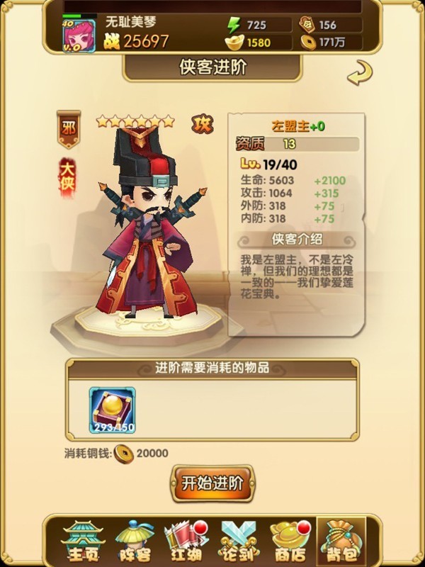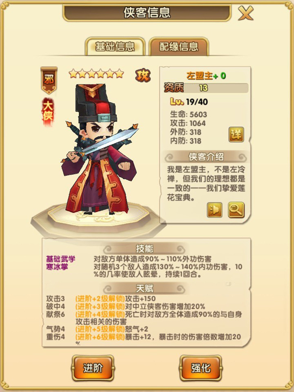 侠客进阶:当侠客强化等级达到当前最大后,可以通过消耗进阶丹,铜钱,侠客和宝物等进阶,提高进阶等级可以大幅度提高攻击,生命,外防。内防属性。