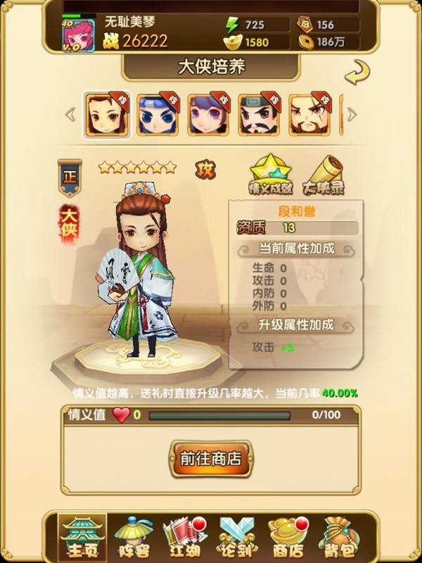 侠客的情义培养:侠客只有侠客类型为大侠的侠客才能进行培养,不包括主角,玩家可以通过消耗礼品增加与侠客的好感度,并且有一定概率可以直接升级,没次升级可以增加一种属性值。