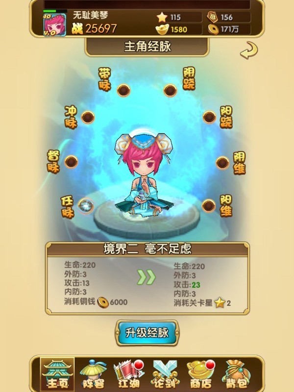 侠客经脉培养:侠客的经脉培养,只有主角才可以,通过消耗通关积分和铜钱可以升级主角的经脉等级,经脉每升高一级就后提升一种属性值,升级获得相同属性还可以叠加。