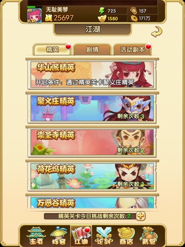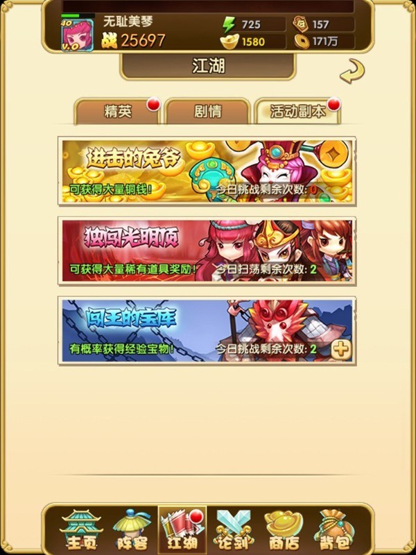 江湖主要有三大分类副本,剧情副本,活动副本和精英副本。