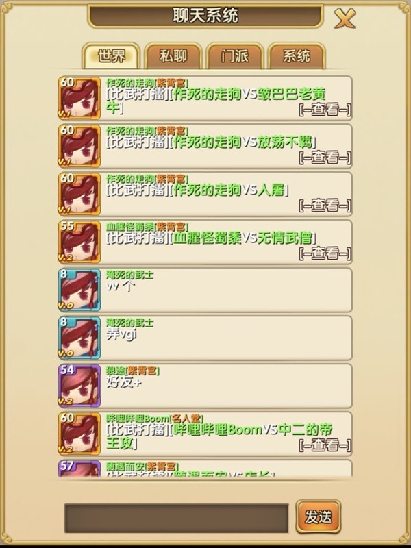 聊天系统共包括“世界频道”,“私聊”,“门派”和“系统”。