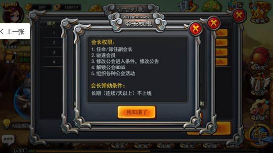 公会达到18级即可开启,花费50元宝就可以创建公会,会长有任命/卸任副会长,驱逐会员,修改公告,加入条件,解锁公会boss等权限,但是连续7天以上没上线。就可以被弹劾下台。