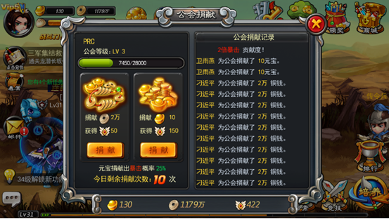 进入公会后,可以通过捐献元宝或者铜钱来获得公会贡献并且提高公会等级。