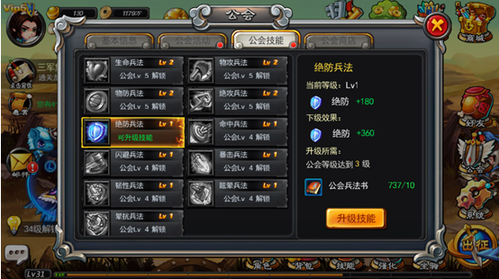 完成公会战役 ,或者在公会商店中购买,可以获得公会兵法书,使用公会兵法书可以提升公会技能。提高自身的属性。