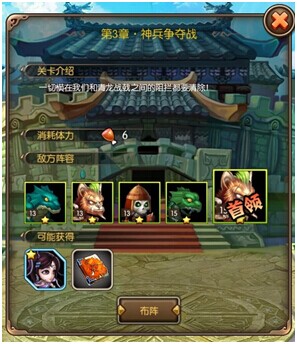 进入战斗时,我们可以在战斗介绍界面清楚地看到此关卡战斗的章节和进度、关卡内容大致介绍、消耗体力数量、地方阵容和可能掉落的装备、感悟等。确定之后,点击“布阵”进入布阵界面。