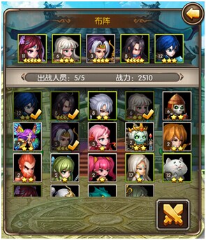 在布阵界面中,我们可以决定此战上阵角色。上阵角色数量上限为5,在旁边可以查看当前战力。在下方的备选英雄中,已上阵的英雄被蒙黑并且带了“√”字样。点击上阵角色的头像可以更换英雄。如果上阵英雄已经确定,就请点击图像下方的双剑按钮开始征战吧!