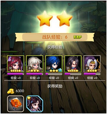 战斗结束后,会有一个战斗结算界面,如图6所示。结算界面上方的星星数量即当前战斗评分状况。在此,您也可以查看战队获得经验和出战队员获得的经验,同时查看您此关战利品和获得的金币。