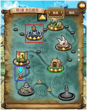 图中,红框中的是已经经历过的大关卡图标。大关卡的图标一般较大,比较具象化。已经经历过的大关卡会变成彩色哟,如果您想回顾之前已经解锁的战斗或者反复刷装备经验和关卡星级,这些已经解锁的大关卡随便进入!大关卡有星级评价,如果您的战斗力和操作技术够高,就可以获得满星也就是三星评价了哟!此关卡目前最高星级会标注在大关卡图标下,如图中绿色框标注所示。而未解锁的大关卡为灰色,如上图后两个大关卡所示,未解锁的大关卡不可进入。
