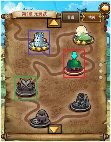 您可以通过点击画面上向上或者向下的图标(黑框中的三角)来查看当前普通战斗已解锁的对应精英战斗关卡。但您只能挑战当前已解锁的精英战斗关卡。未解锁的精英战斗关卡为灰色,如绿框中所示。蓝色箭头标记的为当前关卡。