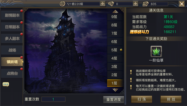 4、每天镇妖塔副本可重置一次,点击界面下方的重置按钮,挑战层数重新回到第一层,点击界面右下角的扫荡按钮,可免费扫荡到之前已挑战到的最高层数,扫荡结束时,所有挑战的奖励将100%给予玩家。