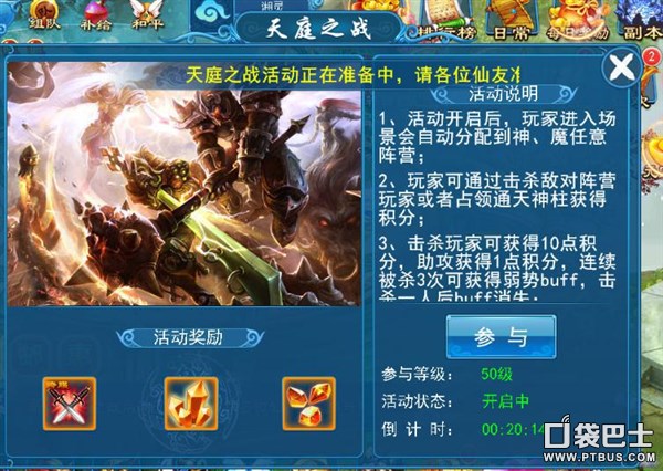二、跨服天庭 夺神柱得积分,百人同屏团战