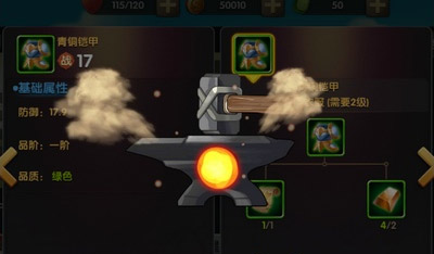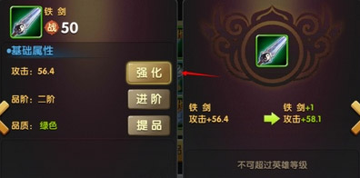 3.装备辅助,即玩家锻造武将的装备。锻造装备完成后,玩家可选择强化、进阶、提品共三种方式为装备强化,即可为武将增加实力。