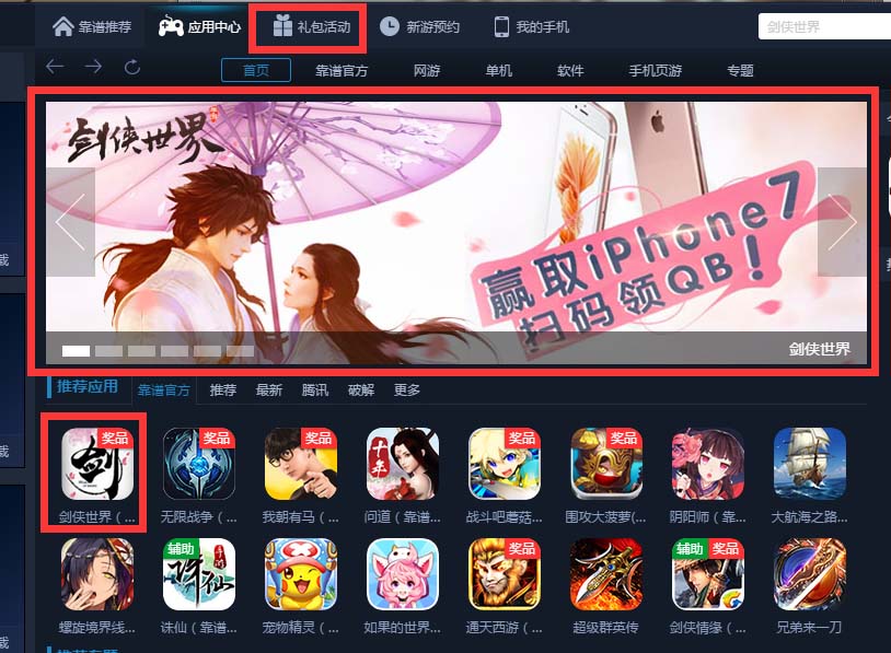 5、 点击靠谱助手软件端“礼包活动”剑侠世界游戏轮播参与活动