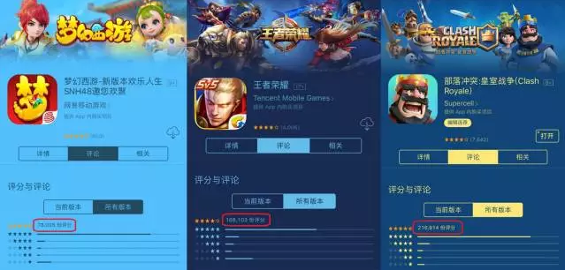 《梦幻西游》《王者荣耀》以及《皇室战争》在App Store上所有版本的评论数(从左往右:7.8万;16.8万;21.7万)