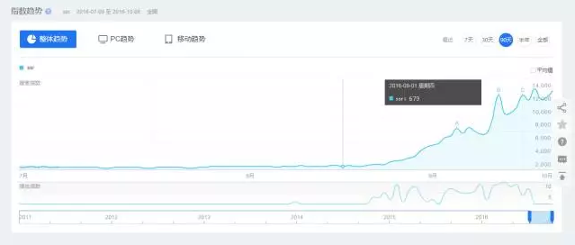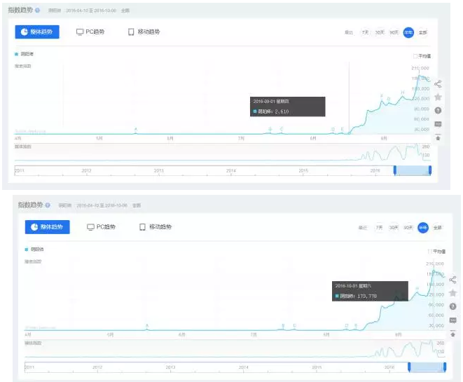 随着微博、朋友圈等社交网络的迅速扩散,“阴阳师”“SSR”等关键词的百度指数也是蹭蹭蹭地往上涨。“阴阳师”在游戏上线之前的普遍百指约2000左右,就在游戏上线(9月1日)之后,迅速上升,并在10月1日达到目前最高值173778。“SSR”也出现了同样的走势。