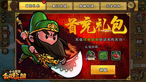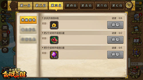 各位主公进入游戏后,每日登录完成指定任务均可获得海量游戏道具奖励。武将升级、武将升星、步兵升级……诸多常规任务完成后均可以领取额外奖励。铜钱、材料、培养道具海量发放,助力各位主公征战天下。