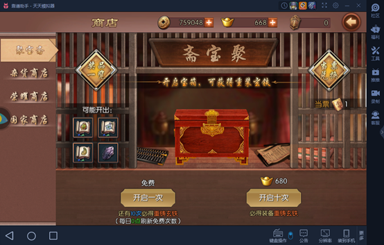 最后商店的聚宝斋里每日都可以免费开启一次,获得的物品可能是装备升级需要的材料也可能是觉醒装备需要的材料。