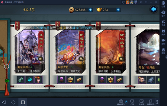 试炼玩法分为多种任务,每种任务都会限定完成次数,随着玩家等级的升高任务的种类也会越来越多,新手每日基本的主要有,(江湖排名)比武、(护送军需)押镖、(破坏敌营)点击放火。