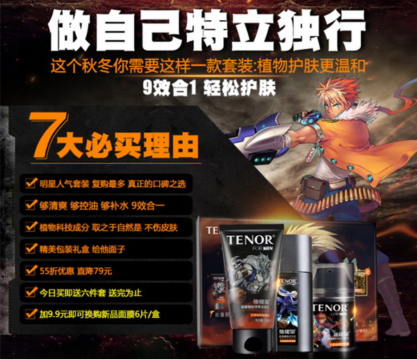 银汉游戏联动他能量旗下销量最多的明星人气套装进行深度定制,将帅气硬朗的狼人、冰魄、枪械师等形象充分植入,成形了黑色酷炫基调的游戏主题套装,呼应了“男士专属”的品牌理念。而他能量明星产品(能量醒肤净爽洁面乳、能量醒肤活力水、能量醒肤焕采乳)控油保湿、成分自然、折扣丰厚、赠品多多等自带属性,给足了你双11把这款定制产品加入购物车的必买理由。