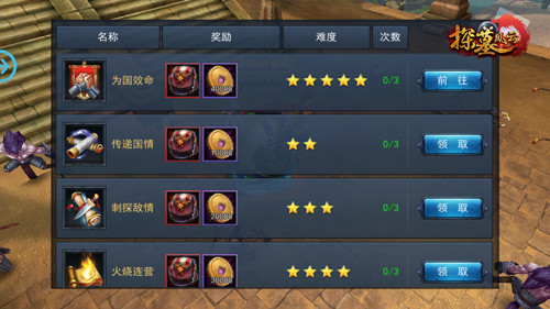 在《探墓风云》手游主界面的“活动”→“日常试炼”选项中,拉到下方便可以看到“国家任务”选项了,目前国家任务共有4项具体任务,每项任务每日可进行3次,值得一提的是,这几项任务的完成难度十分简单,而奖励却非常丰厚。